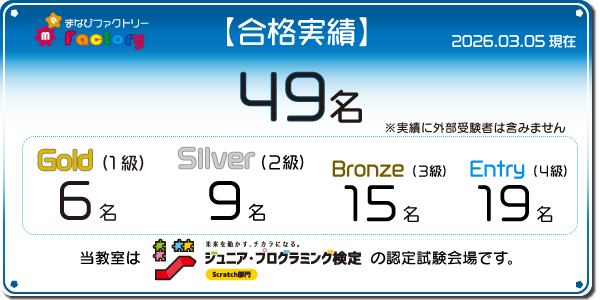 普段のレッスンで使用する独自開発テキストの区切りと、ジュニア・プログラミング検定の級が概ね一致しているので、そろそろ検定合格できるレベルになっているけど、受けてみる?という感じで促すと、やってみたい!というお子さんが多いです。当教室は認定試験会場ですので、一人一人のお子様のタイミングで受験できるのもポイントです!