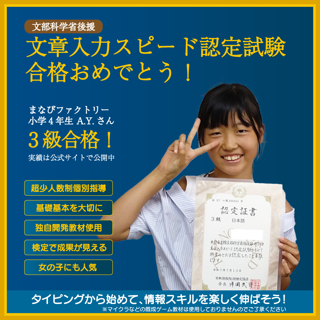 文部科学省後援「文章入力スピード認定試験」で3級認定されました。おめでとうございます!!