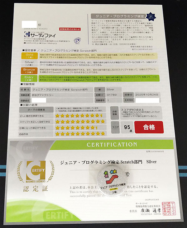 サーティファイ主催「ジュニア・プログラミング検定」の結果が出ましたのでお知らせします。