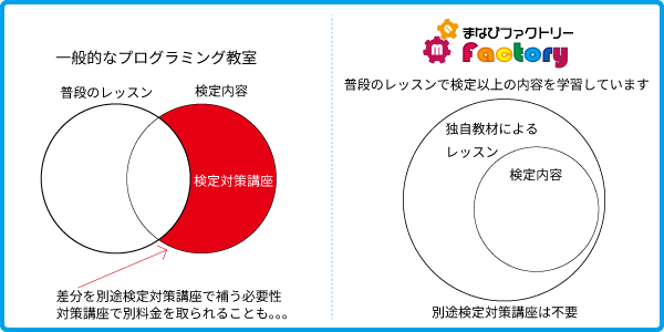 まなびファクトリーでの学びは、特別なことはしていません。独自の教材を一通り学習する中で、自然と知識やスキルが身に付きます。検定は特別なものではなく、学習の成果を客観的に測るための道具であり機会です。普段のレッスンの中に、検定で問われる知識・スキルが含まれています。